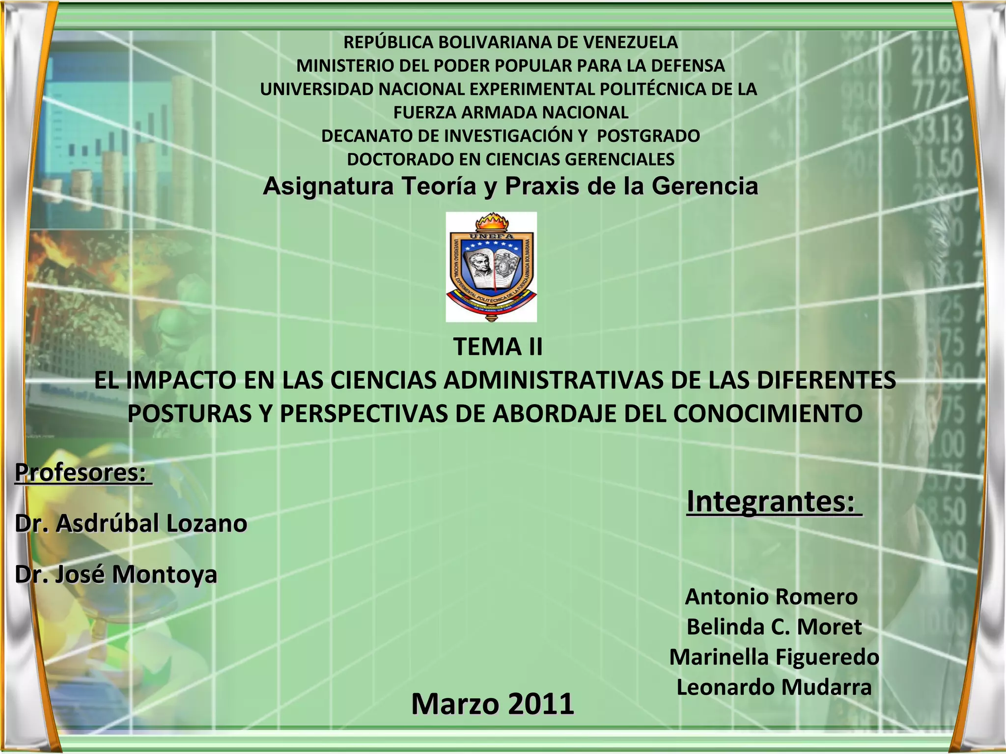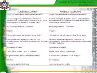 El documento discute diferentes perspectivas epistemológicas como el positivismo, la fenomenología y enfoques complejos, y cómo estas influyen en las ciencias administrativas. También describe paradigmas cuantitativos y cualitativos y sus métodos, y cómo estas perspectivas se aplican en la práctica gerencial. Finalmente, destaca que el conocimiento científico es provisional y está sujeto a revisión continua a la luz de nueva evidencia.