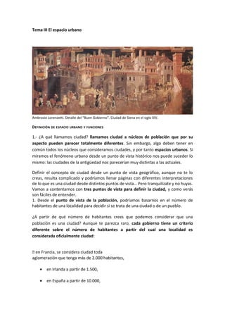 Este documento define el espacio urbano y las funciones de la ciudad. Explica que una ciudad se define por su población, morfología y funciones. Luego describe las principales funciones de una ciudad como la residencial, industrial, comercial, administrativa y otras funciones como la educación, salud y cultura. Finalmente, analiza elementos de la morfología urbana como la disposición de calles, tipos de edificios y cómo las funciones dan forma a diferentes zonas de la ciudad.