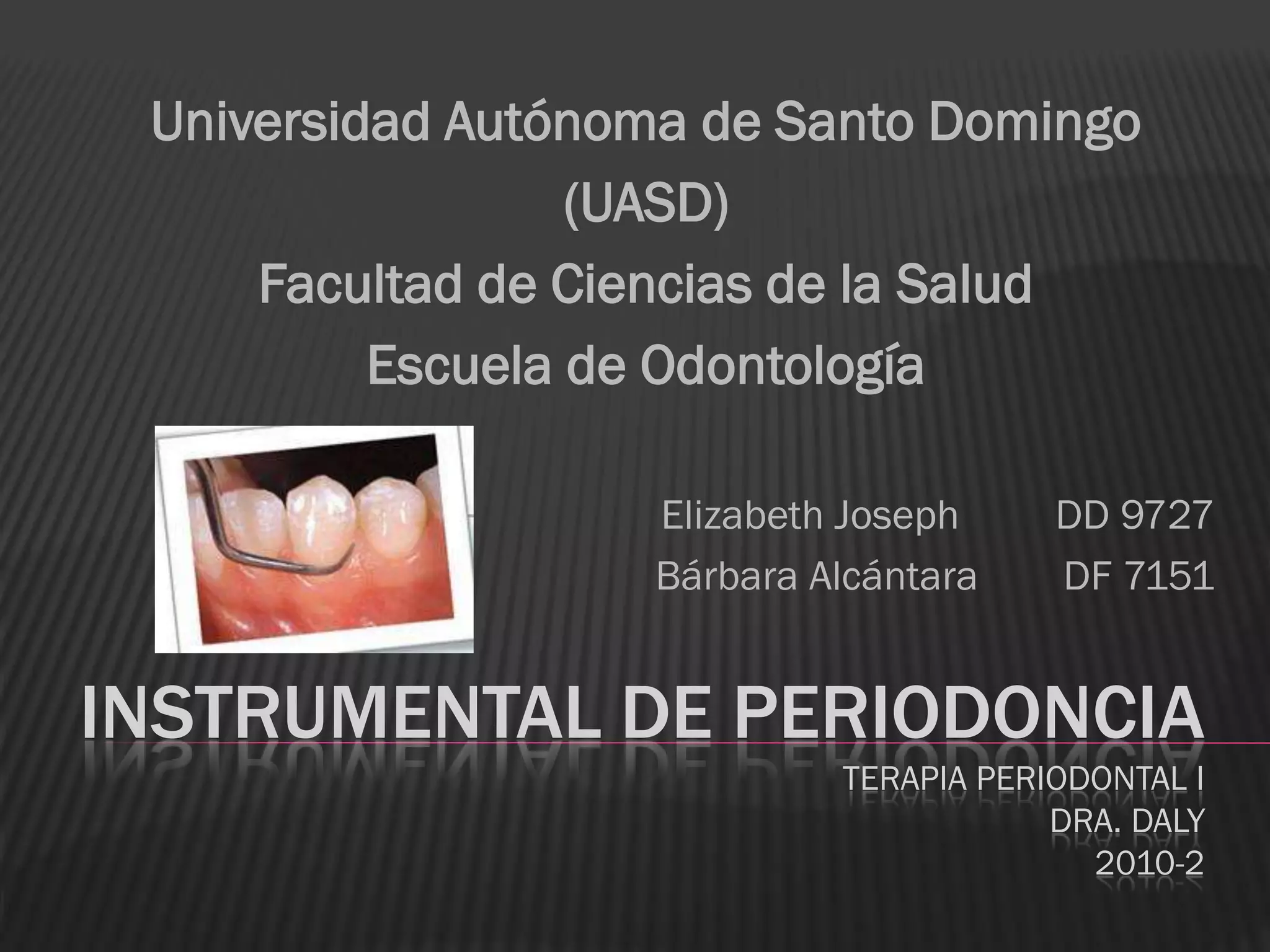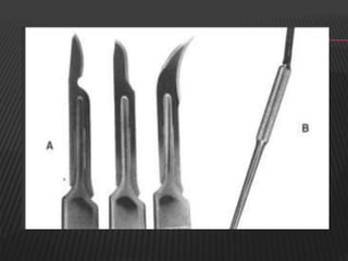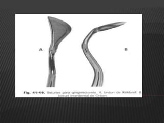El documento describe diferentes tipos de instrumentos utilizados en periodoncia, incluyendo sondas, exploradores, raspadores, curetas y otros. Explica cómo se clasifican y utilizan estos instrumentos para medir bolsas, eliminar placa y cálculo, y tratar tejidos blandos durante terapia periodontal.