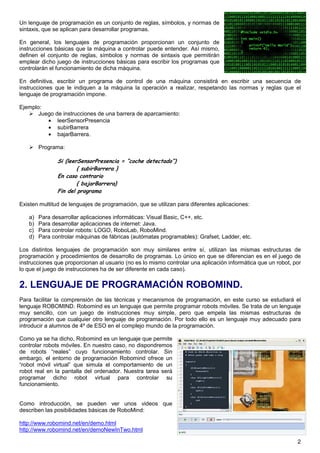 Este documento introduce la programación y el lenguaje de programación RoboMind. Explica que un programa de control define el funcionamiento de una máquina mediante instrucciones. Luego describe las instrucciones básicas de movimiento, visión, pintura y recogida de objetos en RoboMind, así como estructuras como bucles y condicionales para controlar el flujo del programa.