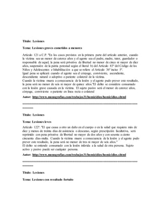 1. El delito de lesiones consiste en causar daño injusto en la integridad física o salud de una persona sin intención de matar. 2. Se consideran lesiones los daños causados tanto en la salud física como psíquica o la capacidad laboral, como mutilaciones, inutilización de miembros, privación de sentidos, limitación para trabajar, deformidades o menoscabo de la salud. 3. Para que sea lesiones y no tentativa de homicidio, el autor debe haber tenido la intención de lesionar y no de matar