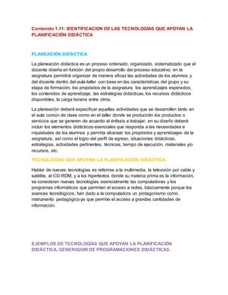 La planeación didáctica es un proceso ordenado que ayuda a los docentes a organizar las actividades de los estudiantes. Las tecnologías como las computadoras y programas informáticos apoyan la planeación didáctica al permitir a los maestros y estudiantes acceder a grandes cantidades de información y recursos para crear un aprendizaje significativo. Ejemplos de tecnologías que apoyan la planeación incluyen generadores de programaciones didácticas que permiten a los maestros obtener más fuentes y desarrollar temas tomando en