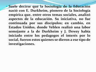 La sociología de la educación surgió con los trabajos de Durkheim en Francia y Veblen en Estados Unidos a finales del siglo XIX. Se desarrolló como campo académico después de la Segunda Guerra Mundial, con autores como Brookower y Gross estableciendo una sociología de la educación "pura". Desde entonces, ha estudiado temas como la función socializadora e instrumental de la educación y su relación con factores socioeconómicos. En España, la sociología de la educación ganó importancia en la década de