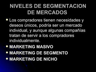 Este documento describe los diferentes niveles y tipos de segmentación de mercados, incluyendo segmentación masiva, por segmento, de nicho, geográfica, demográfica, psicográfica y conductual. Explica cómo las empresas dividen los mercados en grupos distintos de compradores con base en sus necesidades y comportamientos para dirigir productos y marketing específicos a cada segmento.