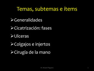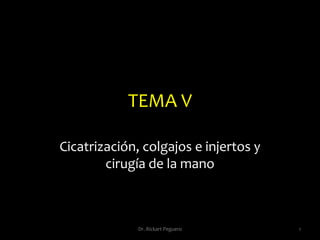 El documento resume los temas de cicatrización, colgajos e injertos y cirugía de la mano. Explica que la cicatrización ocurre en tres fases superpuestas de inflamación, proliferación y maduración. También describe los injertos y colgajos como opciones para cubrir defectos de tejidos, y destaca que las lesiones en la "tierra de nadie" de la mano se asocian con una mala recuperación funcional debido a la agrupación de tendones en esta área.