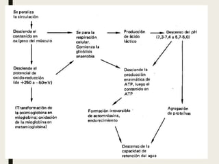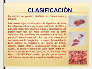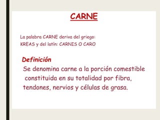 La carne se define como el tejido muscular comestible de los animales. Durante el sacrificio del animal, se producen cambios físico-químicos y bioquímicos que inciden en el color, textura, jugosidad, sabor y aroma de la carne. La maduración es importante para ablandar la carne y desarrollar su sabor característico. La calidad de la carne depende de parámetros como la digestibilidad, terneza, aroma y color.
