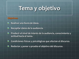 Este documento proporciona información sobre cómo preparar un discurso efectivo. Explica que es importante realizar una lluvia de ideas sobre el tema, investigar a la audiencia, determinar un objetivo específico, y organizar el contenido en una introducción, puntos principales y conclusión. El objetivo general es guiar al orador en la selección del tema, investigación, estructuración y presentación del discurso de una manera que sea relevante y efectiva para la audiencia.