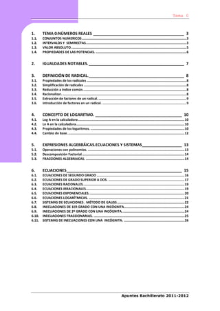 Este documento presenta apuntes de matemáticas para primero de bachillerato. Incluye temas sobre números reales como conjuntos numéricos, intervalos y semi-rectas. También cubre propiedades de las potencias, igualdades notables, definición de radicales, concepto de logaritmo y expresiones algebraicas. Finalmente, explica conceptos sobre ecuaciones y sistemas de ecuaciones.