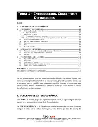 Este documento presenta conceptos básicos de termodinámica. Define sistema, propiedades, estado, proceso y equilibrio. Explica propiedades extensivas e intensivas y variables de estado. Introduce las variables clave de presión, volumen y temperatura, centrándose en la definición de temperatura y la ley cero. Finalmente, presenta unidades y dimensiones de las magnitudes termodinámicas.
