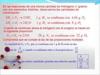 Este documento presenta las leyes fundamentales de la química, incluyendo las leyes ponderales, la teoría atómica de Dalton, y conceptos como el mol y el volumen molar. Explica que las leyes ponderales llevaron a Dalton a proponer su teoría atómica, la cual postula que los elementos están compuestos de átomos indivisibles y que las reacciones químicas implican la recombinación de átomos. También introduce conceptos como el mol, que representa una cantidad de sustancia contenente el número de Avogadro de
