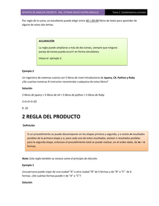 Este documento presenta los principios fundamentales del conteo y la combinatoria. Introduce las reglas de suma y producto para calcular el número de formas en que pueden ocurrir eventos múltiples. Luego explica los conceptos de permutaciones, combinaciones y combinatoria con repetición, ilustrando cada uno con ejemplos numéricos. El objetivo es desarrollar métodos sistemáticos para resolver problemas de conteo y enumeración que surgen en diferentes áreas como teoría de códigos y probabilidad.