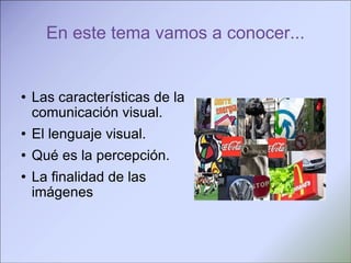 Este documento describe los conceptos clave de la comunicación visual, incluyendo el lenguaje visual, la percepción, y las funciones de las imágenes. Explica que la comunicación visual usa imágenes para transmitir mensajes entre un emisor y receptor, y que el lenguaje visual se basa en signos visuales y normas compartidas. Luego detalla varios principios de organización visual como la proximidad, semejanza, continuidad, destaque y homogeneidad. Finalmente, resume las cuatro funciones principales de las imágenes: informativa, exhort