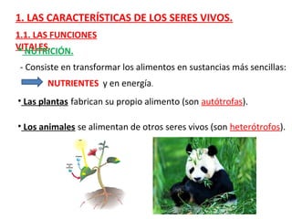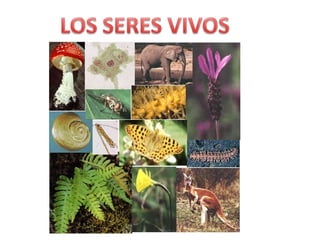 Los seres vivos se clasifican en 5 reinos principales: plantas, animales, hongos, protistas y bacterias. Todos los seres vivos comparten características como la nutrición, relación y reproducción a nivel celular. Las células son la unidad básica de los seres vivos y pueden organizarse en seres unicelulares o pluricelulares, con diferentes tipos de tejidos, órganos y sistemas. Dentro de los reinos se clasifican organismos según su tamaño, estructura y función como las