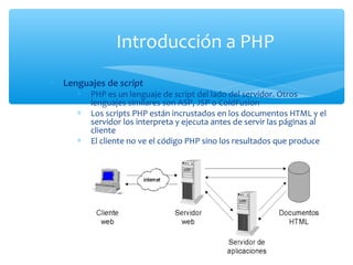 PHP es un lenguaje de script del lado del servidor que se utiliza para crear páginas web dinámicas. El código PHP se ejecuta en el servidor antes de enviar la página al cliente, quien solo ve los resultados. PHP fue creado en 1994 y es ampliamente utilizado hoy debido a su potencia, facilidad de uso y soporte para bases de datos. Para usar PHP se requiere un servidor web como Apache con el módulo PHP instalado.