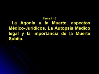 Este documento describe varios aspectos médico-legales relacionados con la muerte, incluyendo la definición de tanatología, los signos de la agonía y la muerte, y la importancia de la autopsia médico-legal. Explica conceptos como la muerte real frente a la aparente, y los signos inmediatos, consecutivos y transformativos de la muerte. También analiza el diagnóstico clínico de la muerte y la importancia de estudiar casos de muerte súbita.