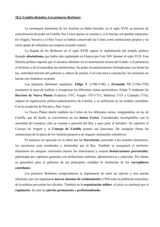 1) La llegada de los Borbones a España en el siglo XVIII trajo consigo reformas administrativas y económicas para establecer un gobierno centralizado y absolutista. 2) Carlos III fue el mejor representante del despotismo ilustrado en España, impulsando reformas para modernizar la sociedad, la economía y la administración. 3) La política exterior de España en el siglo XVIII estuvo definida principalmente por sus alianzas con Francia y su rivalidad con Inglaterra y Austria para mantener su imperio colonial.