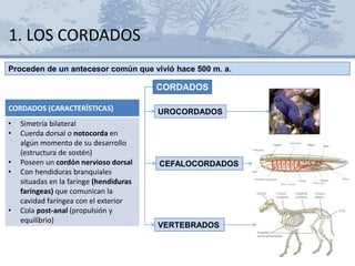 1. El documento describe las características de los cordados y los principales grupos de vertebrados. 2. Los vertebrados se caracterizan por tener columna vertebral en lugar de notocorda y por tener médula espinal y encéfalo. Incluyen peces, anfibios, reptiles, aves y mamíferos. 3. Dentro de los peces se describen sus características como cuerpo fusiforme, aletas y escamas, así como su respiración a través de branquias.