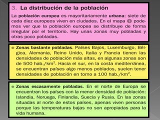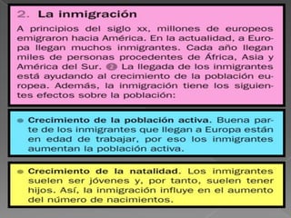 Este documento trata sobre la población y la economía de España y Europa. Explora la población de Europa y España, así como las principales actividades económicas de ambas regiones. Finalmente, incluye preguntas y actividades para repasar y evaluar lo aprendido sobre estos temas.