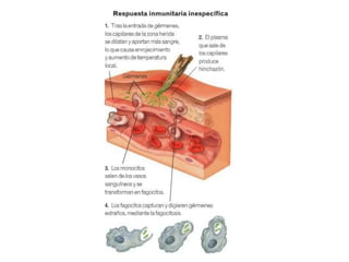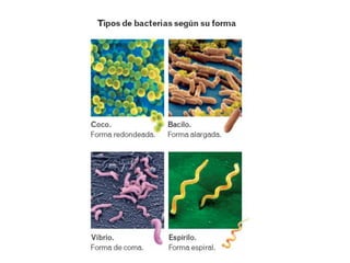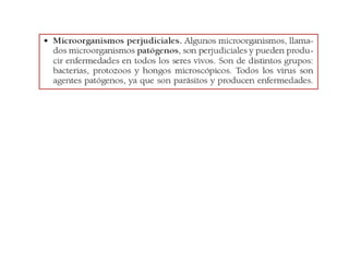 Este documento resume los cinco reinos biológicos, incluyendo protistas, moneras, virus, y hongos. Detalla las características de los protozoos y algas, incluyendo que los protozoos son heterótrofos y unicelulares mientras que las algas son autótrofas y pueden ser unicelulares o pluricelulares. También explica los mecanismos de transmisión de enfermedades infecciosas como la transmisión directa e indirecta, y los métodos de defensa del cuerpo como las barreras físic
