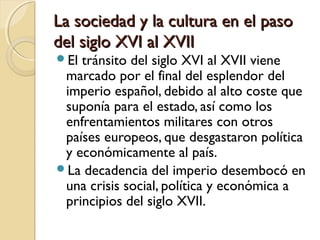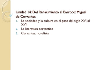 Este documento resume la vida y obra de Miguel de Cervantes. Explica el contexto social y cultural del paso del siglo XVI al XVII, marcado por la decadencia del imperio español. Analiza las principales obras de Cervantes, especialmente El ingenioso hidalgo Don Quijote de la Mancha, que renovó el género de la novela. Finalmente, resume brevemente otras obras como Las novelas ejemplares y Los trabajos de Persiles y Segismunda.