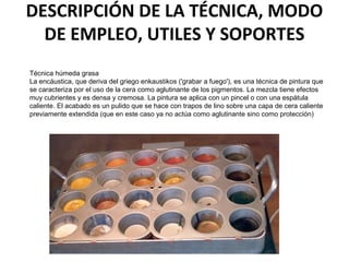 La encáustica es una técnica de pintura antigua que utiliza cera como aglutinante de los pigmentos. Se aplica caliente y produce acabados densos y cubrientes. Tradicionalmente se usaba en tablas de madera y paredes, aunque también en lienzo. Fue popular en la antigüedad y renació en los siglos XVIII y XIX, siendo usada por artistas como Delacroix. En el siglo XX, Jasper Johns la empleó en obras emblemáticas del Pop Art.