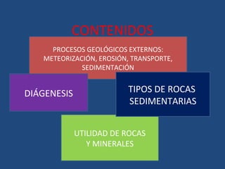 Este documento describe los procesos geológicos externos como la meteorización, erosión, transporte y sedimentación y cómo estos procesos dan lugar a la formación de rocas sedimentarias y al relieve. Explica los diferentes tipos de meteorización física y química, los agentes de erosión y transporte, los ambientes y zonas de sedimentación, y los procesos de diagénesis que convierten los sedimentos en rocas sedimentarias. Finalmente, resume los usos e importancia de las rocas y minerales en la industria y la construcción.