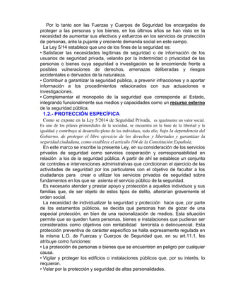 El documento habla sobre los tipos de protección de personas. Explica que existe la protección genérica, que es la que ofrecen las fuerzas de seguridad del estado para proteger los derechos y bienes de todos los ciudadanos. También existe la protección específica, que se enfoca en proteger a personas determinadas que corren un riesgo especial, como líderes políticos o empresarios. El documento también cubre el marco legal de la seguridad privada y cómo puede complementar la protección ofrecida por el estado.