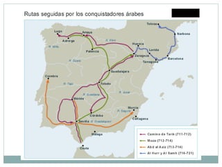 1. La península ibérica fue conquistada por los árabes entre los años 711 y 716, dando inicio a un periodo de dominio musulmán que duró varios siglos. 2. Este periodo estuvo marcado por diferentes etapas políticas como el emirato dependiente de Damasco, el emirato independiente de Córdoba y el esplendoroso califato de Córdoba. 3. En el siglo XI se produjo una crisis que dio lugar a los reinos taifas y la llegada de nuevos imperios norteafricanos como