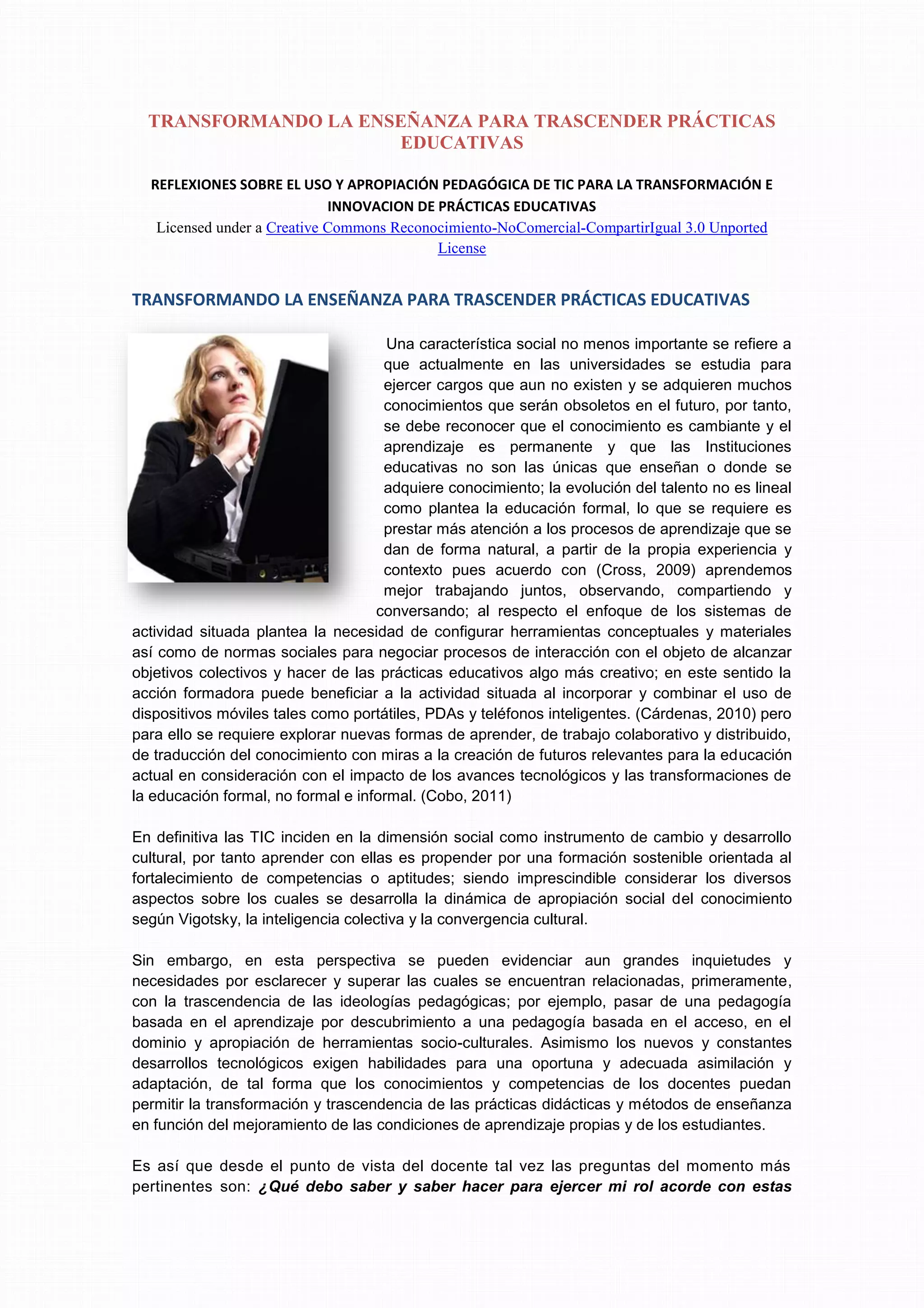 Este documento discute cómo las tecnologías de la información y la comunicación (TIC) pueden transformar las prácticas educativas para trascender los métodos tradicionales de enseñanza. Argumenta que las TIC permiten nuevas formas de aprendizaje colaborativo y distribuido. También enfatiza la necesidad de que los docentes adquieran habilidades para incorporar y adaptar las TIC de manera oportuna y adecuada a fin de mejorar las condiciones de aprendizaje de los estudiantes. Finalmente, plantea que