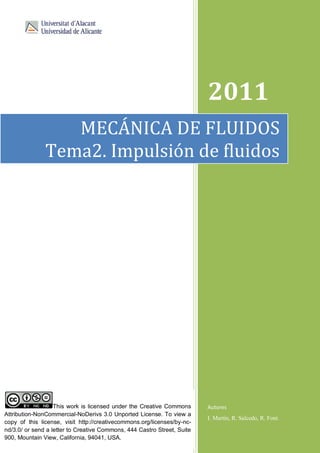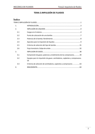 El documento aborda la impulsión de fluidos, incluyendo líquidos y gases, destacando la importancia de la energía necesaria para el desplazamiento a través de sistemas de flujo. Se analizan aspectos técnicos como la ecuación de Bernoulli, criterios para la selección de bombas y equipos, así como consideraciones sobre la cavitación en sistemas de bombeo. Se presentan distintos tipos de equipos y sus características específicas en función del tipo de fluido y su comportamiento.