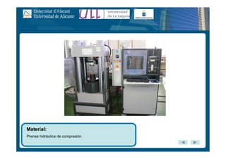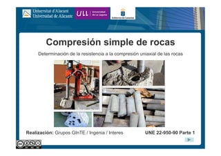 Este documento describe los pasos para determinar la resistencia a la compresión uniaxial de las rocas. Incluye extraer una probeta cilíndrica de roca, cortarla y prepararla para que tenga una relación altura/diámetro de 2,5 a 3,0. Luego, la probeta se coloca en una prensa hidráulica y se aplica una carga continua hasta que se rompa. Finalmente, se mide la carga máxima y se divide por la sección de la probeta para obtener la resistencia a compresión expresada en