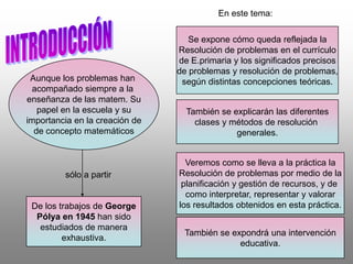 Este documento discute la resolución de problemas en matemáticas. Explica que la resolución de problemas debe ser un eje central en la enseñanza de las matemáticas y describe diferentes clasificaciones, métodos y estrategias para resolver problemas, como el método de Pólya de cuatro fases. También cubre la planificación, gestión de recursos e interpretación de resultados en la resolución de problemas.