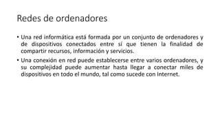 El documento explica conceptos clave sobre redes de ordenadores e Internet. Describe herramientas como HTML, servidores, protocolos HTTP y TCP/IP que permiten compartir y transferir información en la web. También define elementos como URL, IP, DNS y routers que hacen posible acceder y navegar entre páginas web de forma eficiente. Finalmente, introduce las versiones IPv4 e IPv6 del protocolo IP que identifica dispositivos en una red.