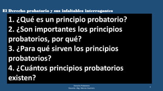 Este documento presenta información sobre los principios del derecho probatorio. Explica que los principios probatorios son reglas generales que regulan la función de la prueba en el proceso legal. Identifica dos principios probatorios específicos - la autoresponsabilidad y la contradicción. La autoresponsabilidad se refiere a que las partes son responsables de aportar la prueba para los hechos que sirven como fundamento para sus argumentos legales. El principio de contradicción establece el derecho de las partes a oponerse y control