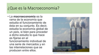 Este documento define y explica conceptos básicos de macroeconomía. La macroeconomía estudia la economía de un país en su conjunto, analizando mercados como el de bienes y servicios, dinero y trabajo. Examina variables como el consumo, inversión, gasto del gobierno, exportaciones e importaciones e indicadores como el PIB, inflación y empleo. El objetivo de la política económica es lograr crecimiento, empleo y estabilidad de precios.