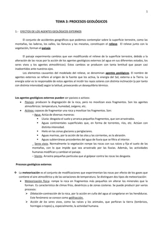 Este documento describe los procesos geológicos externos e internos que modelan la superficie terrestre y dan forma al relieve y paisaje. Los agentes geológicos externos como el agua, el hielo, el viento y los seres vivos erosionan las rocas y transportan los sedimentos, mientras que los procesos internos como la tectónica de placas y la actividad volcánica generan movimientos en la corteza terrestre. Juntos, estos procesos geológicos dan forma al ciclo continuo de formación