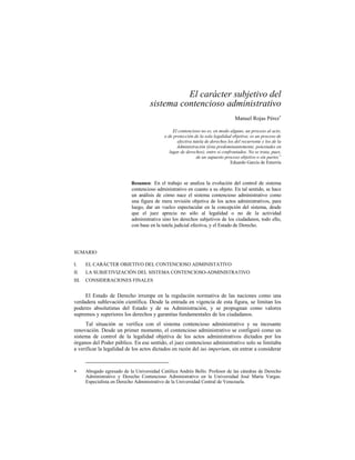 El documento analiza la evolución del sistema contencioso administrativo, el cual nació como un mecanismo de revisión objetiva de los actos administrativos pero luego se transformó en un sistema que tutela los derechos subjetivos de los ciudadanos. Inicialmente, el juez solo verificaba la legalidad de los actos administrativos sin considerar los derechos de los particulares. Pero con el tiempo, y basado en el Estado de derecho y la tutela judicial efectiva, el sistema evolucionó hacia una concepción más subjetiva donde el juez también aprecia los