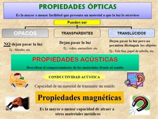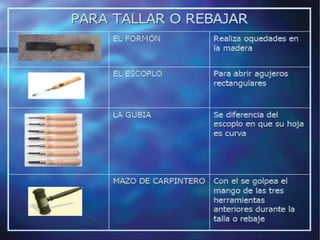 El documento describe diferentes materiales de uso técnico como la madera y los metales. Se centra en los metales, clasificándolos en férricos como el hierro y no férricos como el cobre, y describiendo sus propiedades, obtención y aplicaciones principales. También cubre las herramientas para trabajar la madera y los metales.