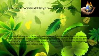 Este documento trata sobre los principios de precaución y la resolución de problemas ambientales. Reconoce que los sistemas técnicos están deteriorando el planeta y propone aplicar el criterio de precaución ante peligros graves e irreversibles a pesar de la falta de certeza científica. También explica que la resolución de problemas implica identificarlos y buscar soluciones no obvias, y menciona problemas ambientales como el cambio climático y el deterioro del medio ambiente.