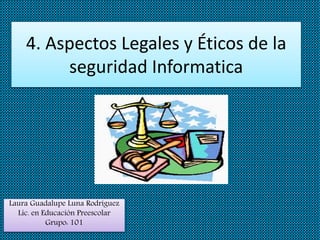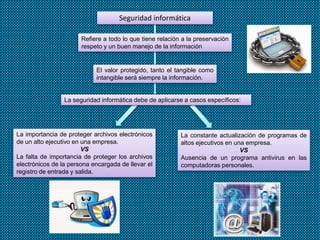 Este documento discute los aspectos legales y éticos de la seguridad de la información. Explica que la seguridad informática se refiere a preservar y manejar la información de manera respetuosa. También destaca la importancia de aplicar la seguridad de manera específica dependiendo del caso, ya sea actualizando programas de ejecutivos o instalando antivirus. Finalmente, resalta que la ética la define cada persona y que la ley requiere seguir normas legales que promuevan una cultura jurídica de protección de la