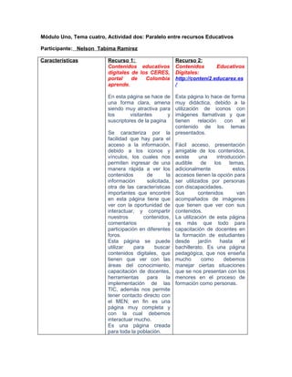 El documento describe la importancia de los recursos educativos digitales para encontrar información en internet. Explica que páginas como Colombia Aprende ofrecen una gran cantidad de contenidos educativos digitales de diferentes áreas del conocimiento de manera clara y atractiva, facilitando el acceso a la información a través de iconos y enlaces. También permite interactuar, compartir contenidos y participar en foros.