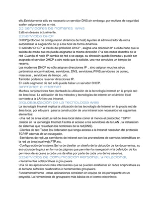 El documento aborda el despliegue y mantenimiento de servicios de red, destacando la importancia de los recursos compartidos como discos y servidores de impresión. También se discuten los servicios de infraestructura TCP/IP, incluyendo DNS y DHCP, así como la transformación de redes locales en intranets. Finalmente, se describen diversas arquitecturas de almacenamiento en red, abordando el desafío del manejo de grandes volúmenes de datos.