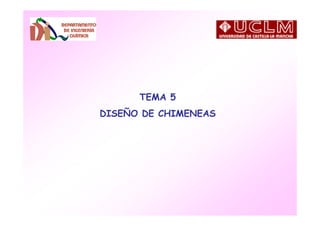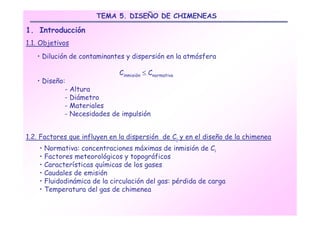Este documento trata sobre el diseño de chimeneas industriales. Explica factores como la circulación del gas, el tiro de la chimenea, el cálculo del diámetro y la velocidad de salida del gas, la importancia de la temperatura del gas, los materiales de construcción y los métodos para calcular la altura de la chimenea, incluyendo el método simplificado y el método riguroso basado en modelos de dispersión.