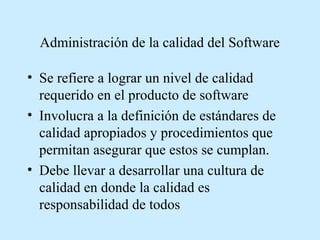 El documento habla sobre la administración de la calidad del software. Explica que involucra definir estándares de calidad apropiados y procedimientos para asegurar que se cumplan, y que la calidad debe ser responsabilidad de todos. También describe las tres actividades principales de la administración de la calidad: aseguramiento de la calidad, planificación de la calidad y control de la calidad. Finalmente, explica que el control de la calidad implica vigilar el proceso de desarrollo para asegurar que se siguen los procedimientos y estándares