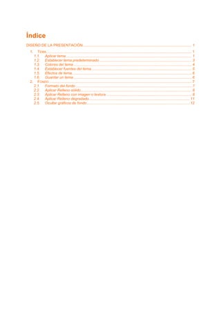 Este documento describe cómo personalizar el diseño de una presentación mediante la aplicación de temas, colores, fuentes y estilos de fondo. Explica cómo aplicar un tema predeterminado, modificar los colores y fuentes de un tema, y guardar cambios realizados en un tema como un nuevo tema personalizado. También cubre las diferentes opciones para aplicar fondos sólidos, degradados, o con imágenes, y cómo ocultar elementos gráficos del fondo de un tema.