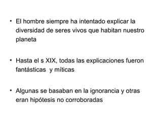 El documento presenta una perspectiva histórica de la teoría de la evolución. Explica que hasta el siglo XIX, la diversidad de seres vivos se explicaba de forma mítica o religiosa. La teoría de la evolución ofrece una explicación científica basada en la variabilidad entre poblaciones, la herencia de características y la selección natural. Aunque hubo críticas, ahora es ampliamente aceptada. Darwin propuso estos tres pilares en 1859. El documento también resume las ideas previas sobre la transformación de especies