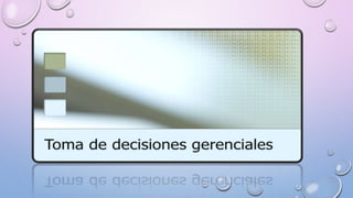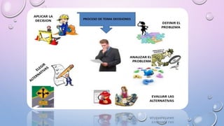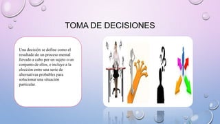 Este documento describe el proceso de toma de decisiones. Explica que una decisión es el resultado de un proceso mental para elegir entre alternativas y resolver una situación. Detalla que la toma de decisiones usa información como insumo fundamental y que existen decisiones programadas que son rutinarias y no programadas para problemas inusuales. También cubre técnicas como el análisis de caso y el desarrollo de habilidades para la toma de decisiones.