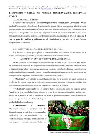Este documento describe el proceso de descolonización de Asia y África en el siglo XX y el surgimiento del movimiento de los países no alineados. Explica las causas de la descolonización, incluyendo el nacionalismo en las colonias, líderes anticoloniales y el apoyo de las Naciones Unidas. También describe las etapas del proceso descolonizador y la independencia de regiones de Asia y África. Finalmente, analiza la herencia colonial y la formación del movimiento de los países no alineados.