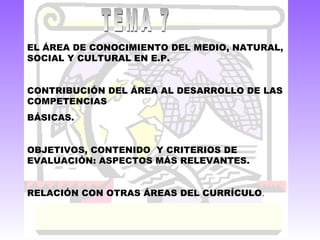 Este documento describe el área de Conocimiento del Medio Natural, Social y Cultural en Educación Primaria. Explica que este área integra diferentes ámbitos del saber como las ciencias naturales, sociales y tecnológicas. También describe los objetivos, contenidos y criterios de evaluación del área, haciendo hincapié en su contribución al desarrollo de las competencias básicas.