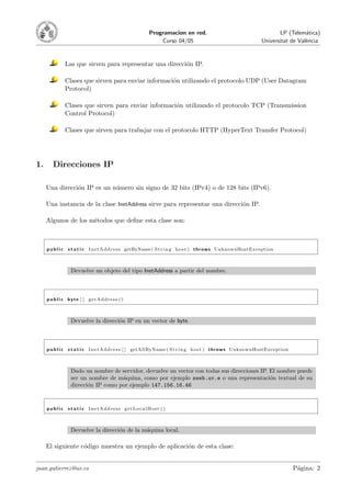 Este documento describe los protocolos UDP y TCP para la programación en red en Java. Explica las clases InetAddress y DatagramPacket para trabajar con UDP, permitiendo enviar y recibir paquetes de datos. También cubre la clase DatagramSocket para crear sockets UDP. Para TCP, presenta su función de garantizar la entrega de paquetes de forma fiable. Por último, detalla el uso de estas clases para simular la transmisión de datos de cohetes y estaciones de radar a través de UDP.